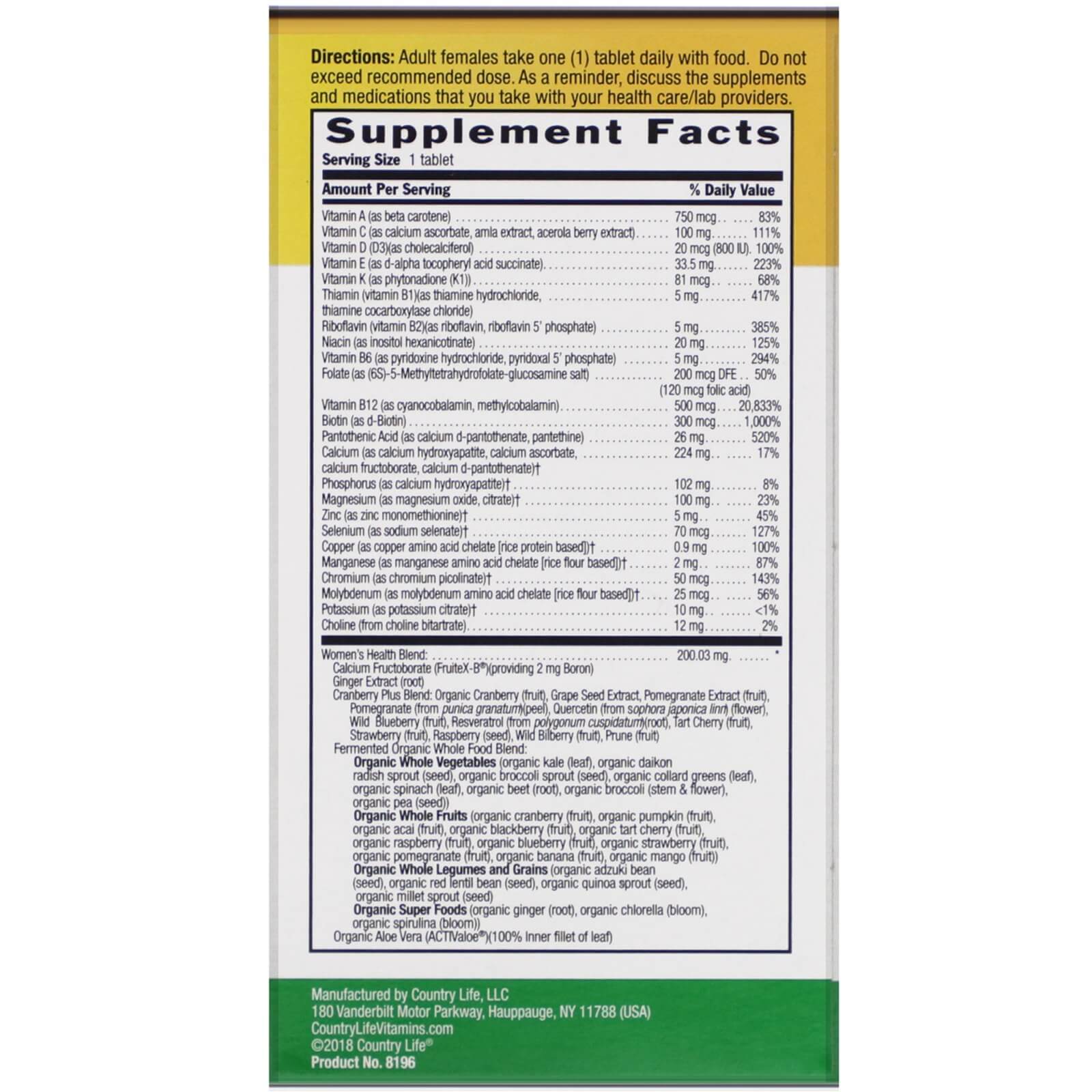 Компания основана в 1971 г. Мультивитамины принимаются один раз в день Отсутствие глютена подтверждено сертификатом Пищевая добавка Хватает на 2 месяца Смесь для поддержки женского здоровья: более 200 мг Произведено из 30 сырых цельных продуктов «Коферментная» форма витаминов группы B для энергии А также пробиотики, пищеварительные ферменты и алоэ Сертифицированная благотворительная корпорация – Гарантия профессиональной добросовестности – Подлинность Чистота Свежесть Постоянство Точность