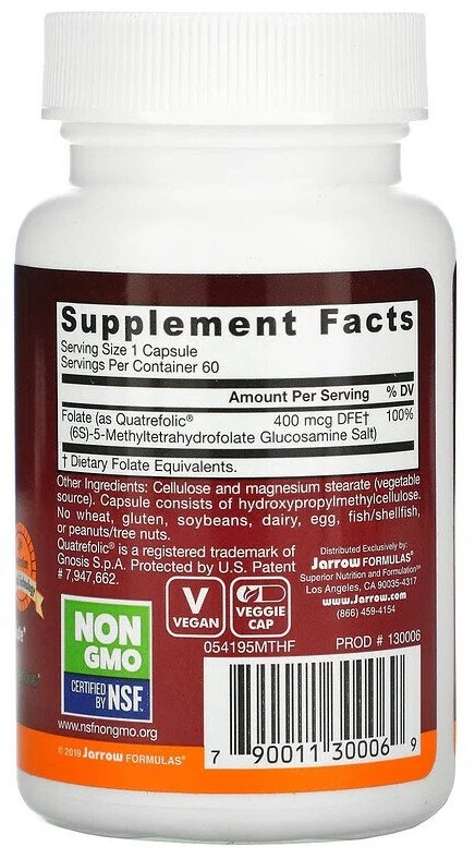 Описание(6S)-5-метилтетрагидрофолат глюкозаминовая сольТехнология производства фолиевой кислоты 4-го поколенияБиологически активная форма фолиевой кислотыQuatrefolic®Не содержит ГМО — сертификат NSFВегетарианская капсулаПищевая добавкаПодходит для вегетарианцев и вегановМетилфолат ((6S)-5-метилтетрагидрофолат или (6S)-5-MTHF) — это эффективная биологически активная форма фолиевой кислоты. Quatrefolic® — технология производства фолиевой кислоты 4-го поколения. Из-за физиологических стрессов, индивидуальных особенностей, а также ограниченной способности организма преобразовывать синтетическую фолиевую кислоту в активную форму фолиевой кислоты (что может привести к накоплению неметаболизированной фолиевой кислоты в организме и препятствовать транспортировке и метаболизму естественных фолатов) добавки с 5-MTHF крайне рекомендованы к употреблению. В отличие от фолиевой кислоты, 5-MTHF может проникать через гематоэнцефалический барьер и не маскирует дефицитную…