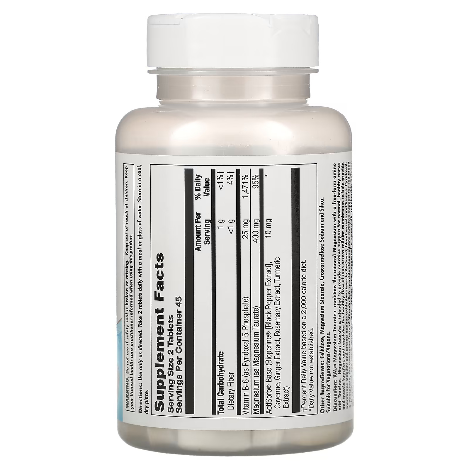 KAL Magnesium Taurate + сочетает в себе минерал магния со свободной аминокислотой таурин. Магний предназначен для обеспечения питательной поддержки нормальной, здоровой нервной и мышечной функции и регулирует здоровый поток ионов через клеточные мембраны, чтобы помочь обеспечить стабильность мембраны и защитить от окислительного стресса в сердце, кровеносных сосудах и тканях. Пиридоксаль-5-фосфат, коферментная форма витамина B-6, обеспечивает биодоступную питательную поддержку для синтеза эритроцитов и функции нервной ткани. Исследования показали синергетическую связь между магнием и витамином B-6. Способ применения: Принимать только по назначению рача. Принимайте по 2 таблетки ежедневно с едой или стаканом воды.