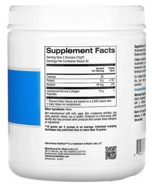 – Пептиды гидролизованного коллагена типов I и III – от Lake Avenue Nutrition – Порошок с нейтральным вкусом – Для здоровья волос, кожи, ногтей, суставов и костей* – Не содержит ГМО, глютена и сои – Производится на предприятии, имеющем регистрацию GMP Lake Avenue Nutrition предлагает продукты высокого качества по доступным ценам. Наши пептиды коллагена можно добавлять в горячий кофе или чай, сок, воду, суп, овсянку, йогурты и смузи. Рекомендации по применению: Растворите 2 мерные ложки (10 г♦) порошка в напитке, который вы любите, или который вам порекомендовал врач.