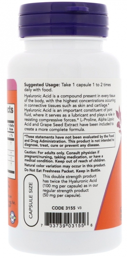 ОписаниеПоддержка суставовНеобходимый компонент синовиальной жидкостиСодержит МСМ (метилсульфонилметан)Без гмопищевая добавкаВегетарианский и веганский продуктКошерный продуктОбщее состояние здоровьяСемейное предприятие, основанное в 1968 годуИмеет регистрацию надлежащей производственной практики (GMP)Гиалуроновая кислота — это соединение, присутствующее во всех тканях организма, причем самые высокие концентрации встречаются в соединительных тканях, таких как кожа и хрящ. Гиалуроновая кислота — важный компонент суставной жидкости, где она служит смазкой и играет роль в сопротивлении силам сжатия. МСМ добавлен в этот продукт в качестве природного соединения серы, содержащего химические связи, необходимые для формирования и укрепления соединительных тканей в организме человека, в том числе суставного хряща. Рекомендации по применениюПринимать по 2 капсулы 1–2…