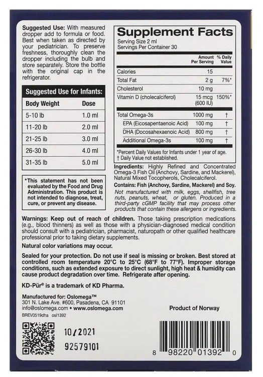 Педиатры и другие квалифицированные медицинские работники часто рекомендуют витамин D, а также омега-3 жирные кислоты, содержащиеся в рыбьем жире, для здорового роста и развития мозга у детей. ДГК с витамином D для детей от Oslomega содержит высокоочищенный концентрированный рыбий жир KD-Pür, который обрабатывается в Норвегии и содержит 800 мг ДГК, а также 600 МЕ витамина D на порцию.