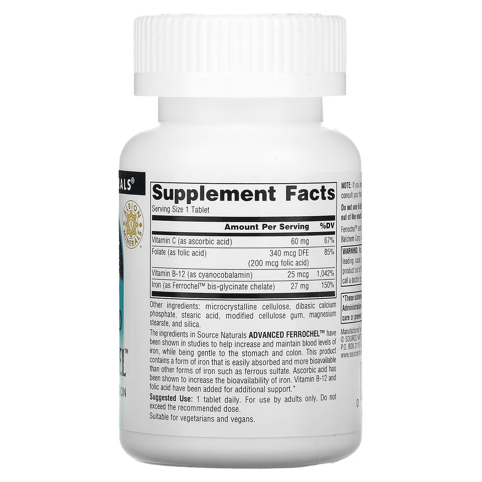 Albion Minerals Пищевая добавка Содержит 27 мг железа Подходит для вегетарианцев и веганов Исследования показали, что ингредиенты Source Naturals Advanced Ferrochel помогают повысить и поддерживать уровень железа в крови, не воздействуя на желудок и толстую кишку. Этот продукт содержит форму железа, которая легко усваивается и более биодоступна, чем другие формы железа, такие как сульфат железа. Доказано, что аскорбиновая кислота увеличивает биодоступность железа. Добавлены витамин B12 и фолиевая кислота для дополнительной поддержки.